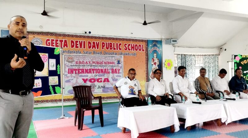 देवघर: गीता देवी डीएवी पब्लिक स्कूल, भंडारकोला में आज 11 वां अन्तर्राष्ट्रीय योग दिवस मनाया गया। विदित हो कि भारत के प्रधानमंत्री नरेंद्र मोदी ने संयुक्त राष्ट्र महासभा में इस दिन को मनाने का प्रस्ताव रखा था और उसकी मंजूरी मिलने के बाद योग दिवस की शुरुआत 2014 में हुई। इसके बाद पहला योग दिवस 21 जून 2015 को मनाया गया। इस वर्ष योग दिवस का थीम है “एक पृथ्वी, एक स्वास्थ्य के लिए योग।”इस अवसर पर स्कूल में और स्कूल के बाहर भी गीता देवी डीएवी के बच्चों के द्वारा कई कार्यक्रम में उपस्थिति दर्ज की गई ।
