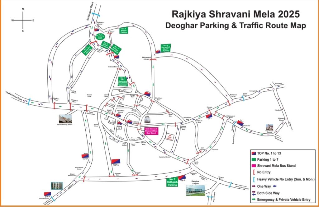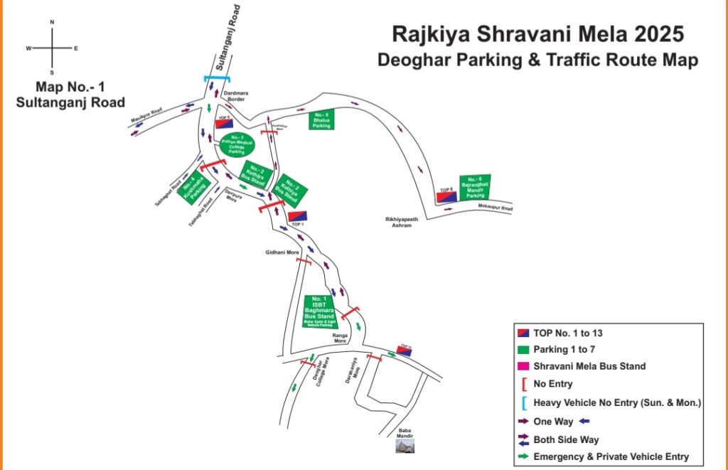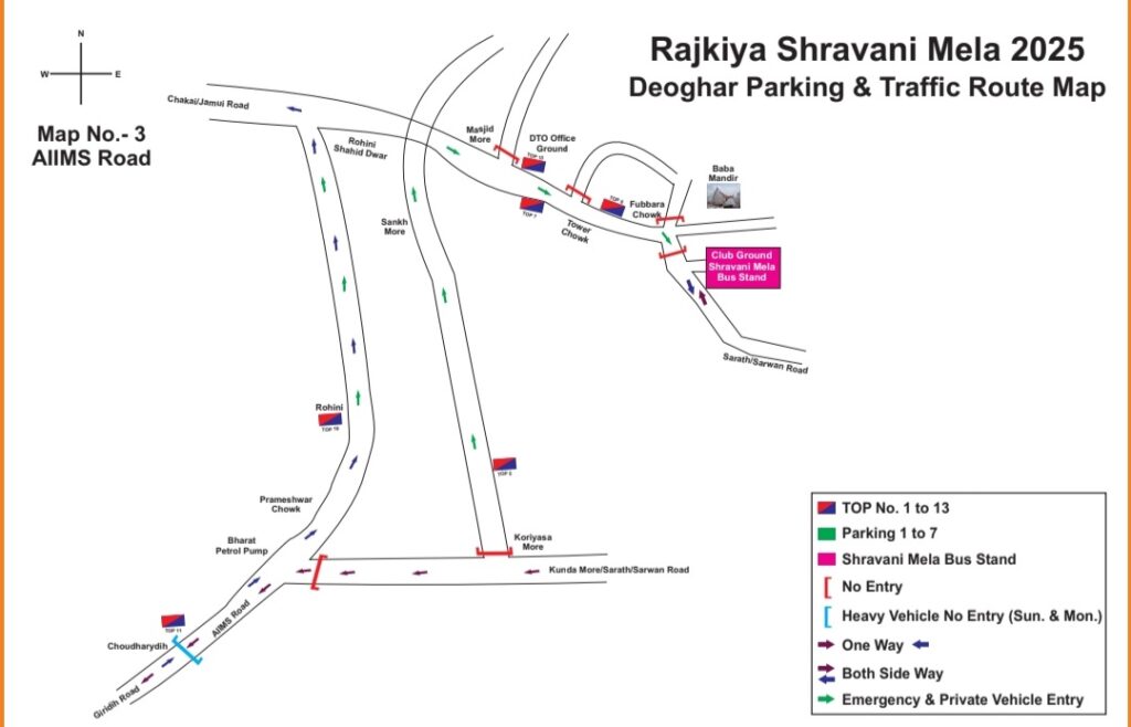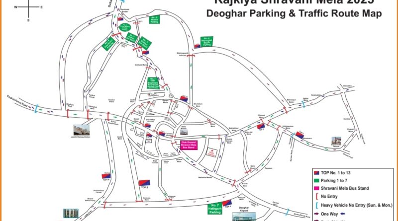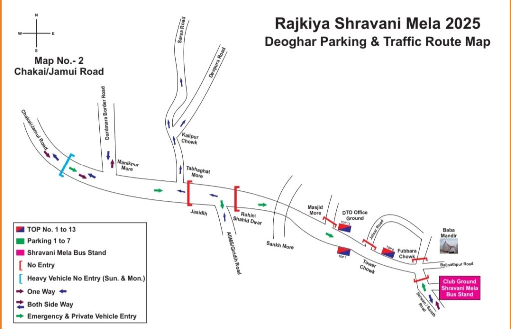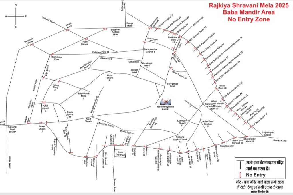 - राजकीय श्रावणी मेला-2025 के मद्देनजर बाबा मंदिर, देवघर क्षेत्रान्तर्गत श्रद्धालुओं का सुगम आवागमन हेतु विभिन्न प्रवेश बिन्दु पर ओटो, टोटो एवं अन्य वाहनों का पूर्णतः प्रवेश निषेध जोनः-