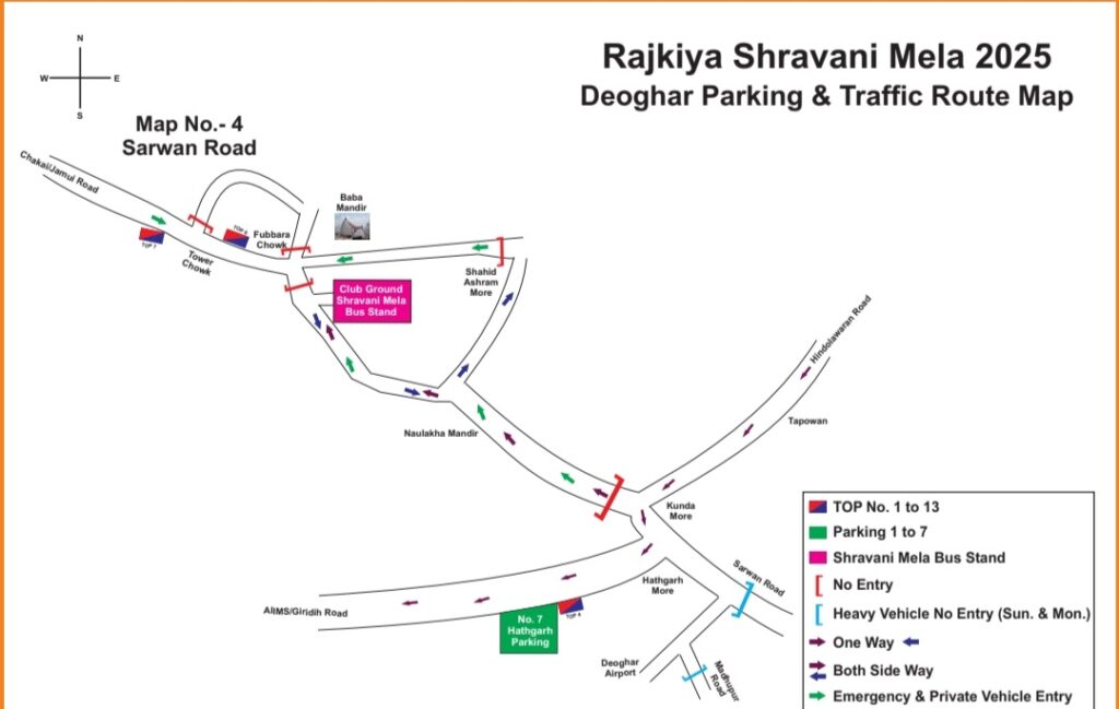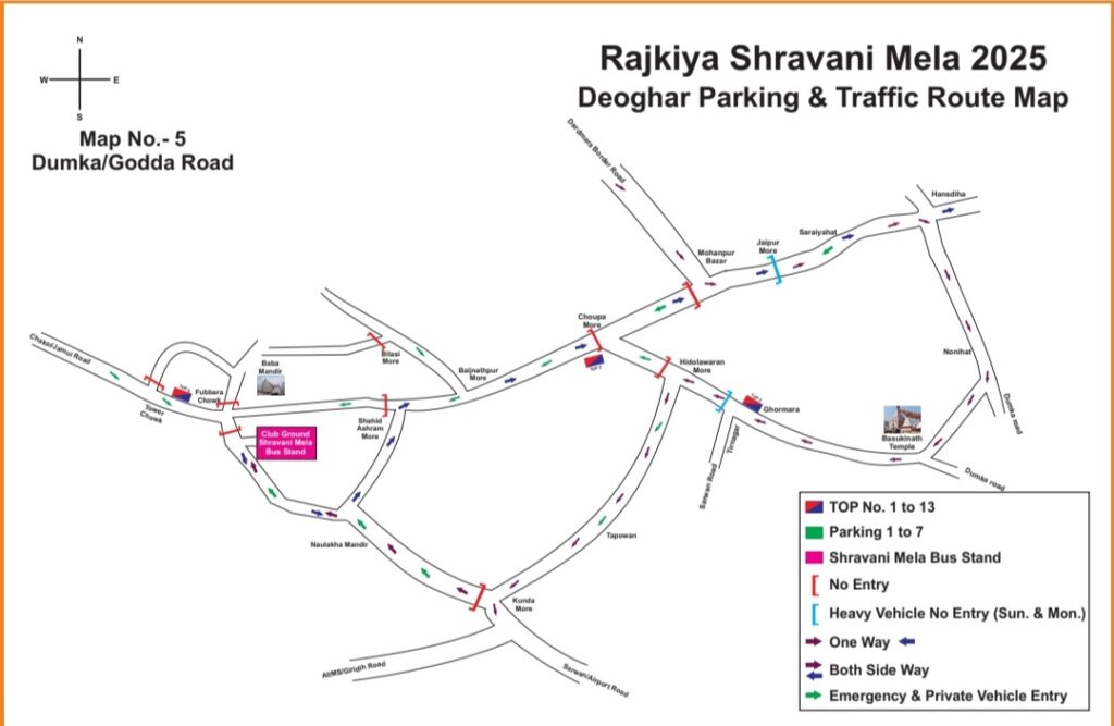 (iv) दुमका की ओर से आने वाली श्रद्धालुओं का वाहन – हिण्डोलावरण से बायें मुड़कर तपोवन, उजाला चौक, पुराना कुण्डा थाना मोड़, हथगड़ मोड़ होते हुए हथगड़ मैदान में पार्क होगी।