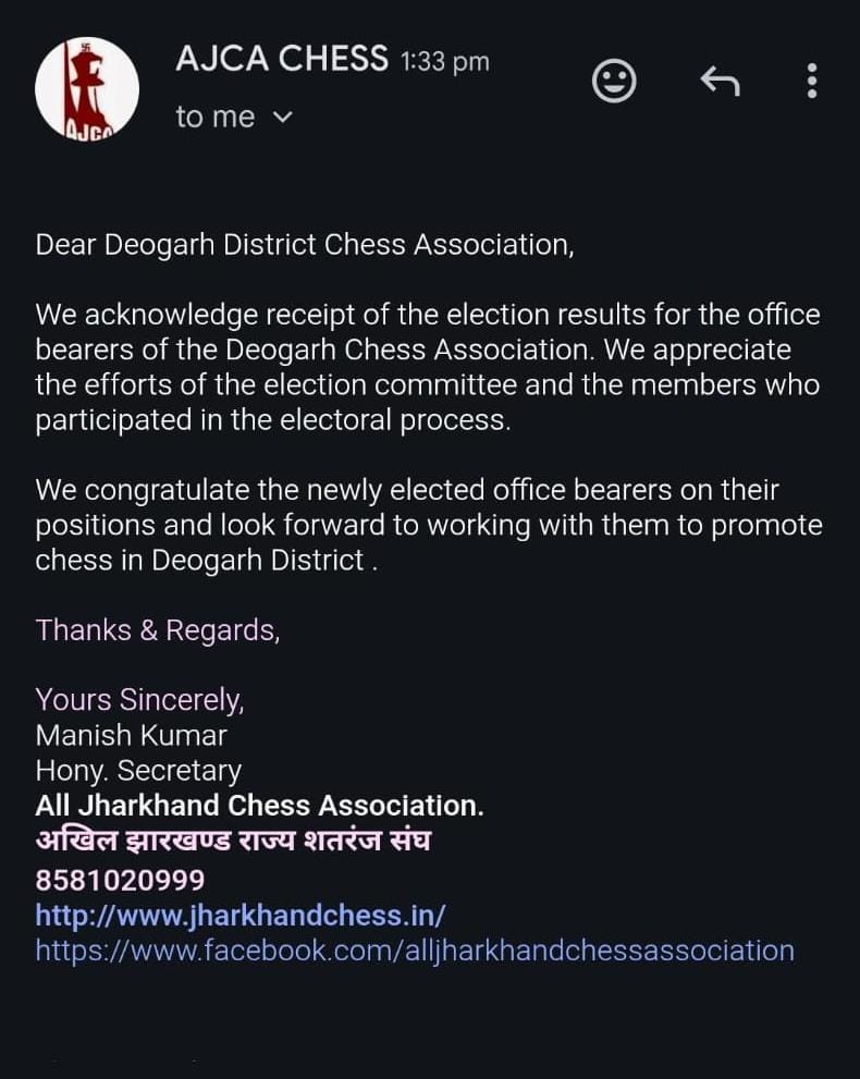 नवनिर्वाचित सचिव आशीष झा ने बताया कि नई कार्यकारणी की जानकारी और बैठक का सारा रिपोर्ट mail के माध्यम से अखिल झारखंड राज्य शतरंजसंघ को दे दी गई थी। झारखंड राज्य के मेल का अप्रूवल का इंतजार कर रहे थे। राज्य संघ के सचिव मनीष कुमार ने आज (7 जुलाई) को ऑफिशियल मेल के माध्यम से नई कार्यकारणी को बधाई दी और इसकी पुष्टि की ।