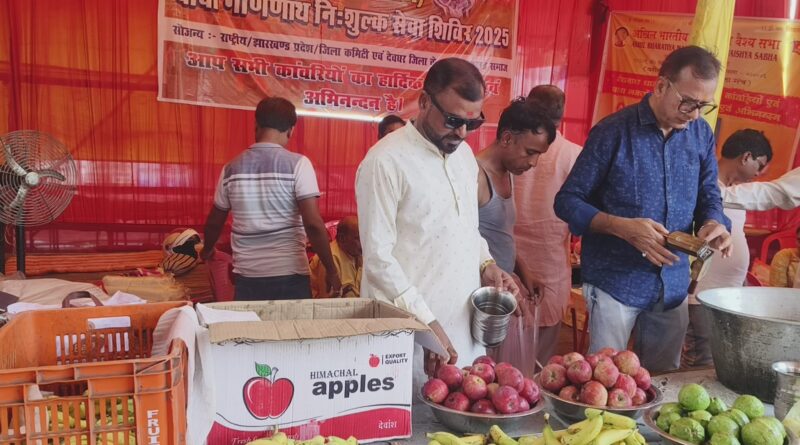 देवघर: अखिल भारतीय मध्य देशीय वैश्य सभा द्वारा दर्शनियां मोड़ के पास संचालित बाबा गणिनाथ निःशुल्क सेवा शिविर में कांवरियों की सेवा पूरे श्रद्धा और समर्पण भाव से की जा रही है। यह सेवा शिविर लगातार दस वर्षों से संचालित हो रहा है और इस बार भी कांवरियों के लिए विशेष प्रबंध किए गए हैं। युवा राष्ट्रीय अध्यक्ष ध्रुव प्रसाद साह और झारखंड प्रदेश अध्यक्ष कुंदन कुमार गुप्ता के नेतृत्व में गोड्डा से आए समाज के सदस्यों ने कांवरियों के बीच फल, मिठाई, ठंडा पानी, शर्बत और चाय का वितरण किया। साथ ही लंबी यात्रा के थकान से जूझ रहे श्रद्धालुओं के पैरों में दर्द निवारक स्प्रे लगाकर उन्हें राहत भी प्रदान की गई।