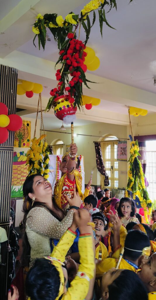 कार्यक्रम के अंत में “आला रे आला गोविंदा आला” की धुन पर बच्चे ऊपर लटके मटके के चारों ओर गोल-गोल घूम कर नृत्य करते हुए मटकी का भेदन किया।