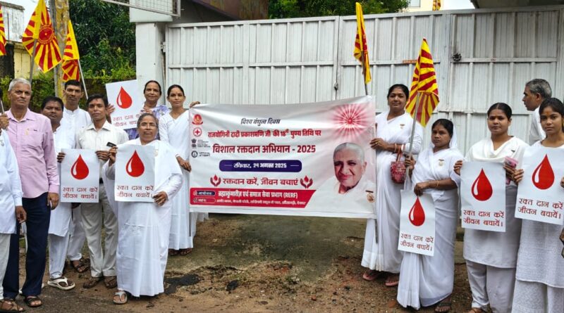 देवघर: ब्रह्मा कुमारीज के समाज सेवा प्रभाग (R E R F) के देवघर सेवा केंद्र द्वारा ब्रह्माकुमारीज की पूर्व मुख्य प्रशासिका दादी प्रकाशमणि जी की 18वीं पुण्यतिथि 25 अगस्त 2025 विश्व बंधुत्व दिवस के अवसर पर रविवार 24 अगस्त को लगने वाले मेगा रक्तदान शिविर को सफल बनाने के लिए एक विशाल रक्तदान रैली का आयोजन 23.08. 2025 शनिवार को सुबह 8.30 से 9.30 बजे देवघर सेवा केंद्र के मुख्य प्रभारी रीता दीदी के द्वारा किया गया। जिसका लक्ष्य लोगो के अंदर रक्त दान करने से व्याप्त डर को खत्म करना एवं रक्त दान से होने वाले फ़ायदों के बारे में लोगो को जागरूक कर रक्तदान के लिए प्रेरित करना था।