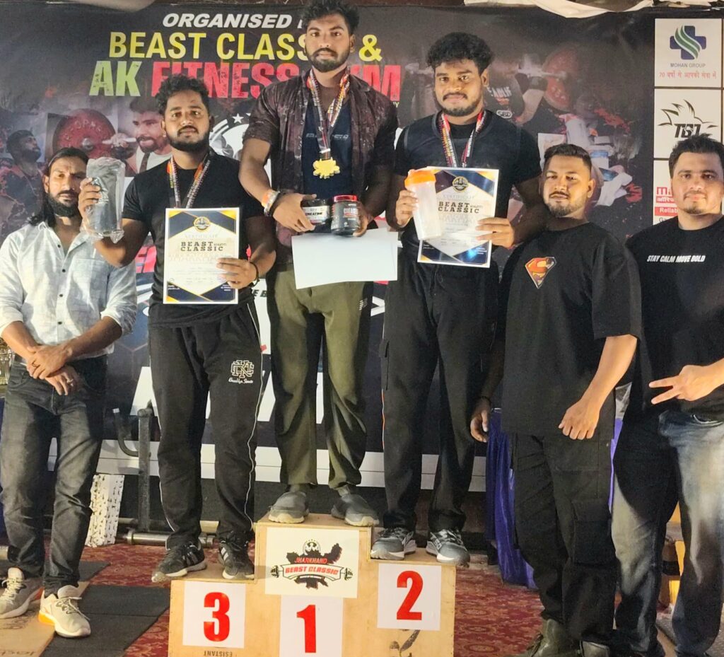 देवघर: झारखंड के खूंटी जिला के भगत सिंह चौक, नगर भवन मे आयोजित बीस्ट क्लासिक स्टेट पावर लिफ्टिंग, बेंच प्रेस एंड डेडलिफ्ट प्रतियोगिता, 2025 में आयुष संतोषी ने सब जूनियर केटेगरी के 74 किलोग्राम के बेंच प्रेस में पूरे 29 प्रतिभागियों को पछाड़कर प्रथम स्थान प्राप्त कर सिर्फ देवघर जिला ही नहीं बल्कि पुरे राज्य में अपना और अपने परिवार का मान बढ़ाया है। वहीं जूनियर केटेगरी के 74 किलोग्राम बेंच प्रेस में भी आयुष संतोषी ने पूरे 24 प्रतिभागीयो में प्रथम स्थान प्राप्त किया। साथ ही सब जूनियर एवं जूनियर कैटेगरी मे सभी वेट कैटेगरी मे सबसे अधिक जीएल स्कोर प्राप्त कर बेस्ट लिफ्टर मेंस बेंचप्रेस का टाइटल भी अपने नाम किया।