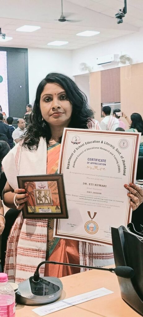 दिनांक 5.9.2025 को शिक्षक दिवस के अवसर पर झारखंड सरकार शिक्षा विभाग रांची के द्वारा डॉ इति को उत्कृष्ट शिक्षण कार्यों के लिए “स्टेट मास्टर ट्रेनर “ के तौर पर जे ई पी सी कार्यालय, रांची में माध्यमिक शिक्षा निदेशक, राजेश प्रसाद, परियोजना उप निदेशक प्रदीप चौबे, बांके बिहारी सर एवं अन्य गणमान्य पदों से सुभोषित लोगों के कर कमलों से सम्मानित किया गया।