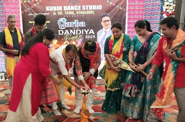 देवघर: आज दिनांक 23.09.25 शारदीय नवरात्र के दूसरे दिन विरोय इन में क्यूबिक डांस स्टूडियो व सुप्रसिद्ध जनसेवक डॉ सुनील खवाड़े के संयुक्त तत्वावधान में गरबा व डांडिया नाइट का आयोजन किया गया। आयोजन की शुरुआत मुख्य अतिथि डाॅ सुनील खवाड़े के स्वागत के साथ किया गया। इस दौरान डांस अकादमी के बच्चों ने मुख्य अतिथि को डांडिया नृत्य के साथ मुख्य मंच तक लाया। साथ ही निदेशक प्रीति केसरी ने मुख्य अतिथि को पुष्पगुच्छ व अंगवस्त्र भेंटकर स्वागत किया। दीप प्रज्वलन व मां दुर्गा की आराधना के साथ नृत्य का विधिवत शुरुआत किया गया।