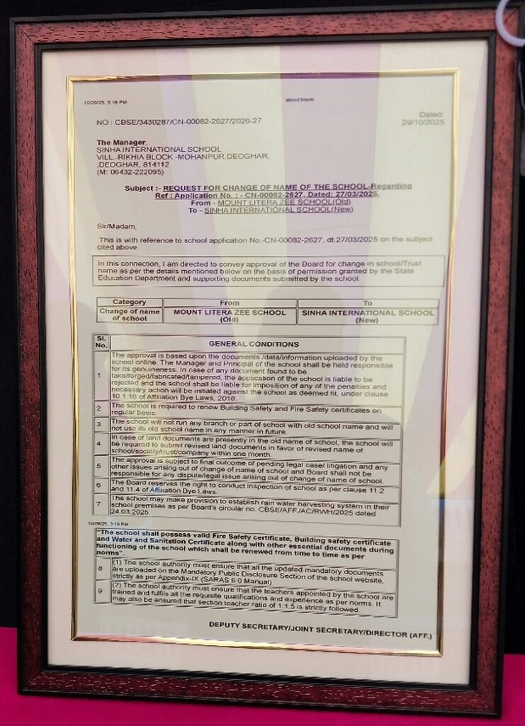 देवघर: रिखिया अवस्थित माउंट लिटेरा जी स्कूल का नाम अब सिन्हा इंटरनेशनल स्कूल हो गया। माउंट लिटेरा जी स्कूल के फ्रेंचाइस से इसके मैनेजमेंट ने स्वयं को अलग करते हुए सिन्हा इंटरनेशनल स्कूल का नाम दे दिया और अब यह खुद ही फ्रेंचाइस बाँटेगी।