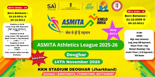 देवघर: खेल एवं युवा मामले ,भारत सरकार (साई) द्वारा भारतीय एथलेटिक्स संघ, नई दिल्ली तथा झारखंड एथलेटिक्स संघ के अधिनस्थ संबद्ध देवघर जिला एथलेटिक्स संघ द्वारा देवघर जिले में अस्मिता लीग (बालिका) एथलेटिक्स का आयोजन के के एन स्टेडियम देवघर में 14 नवंबर को प्रातः 9:00 बजे से किया जाएगा। जिसमें विजेता खिलाड़ियों को मेडल, सर्टिफिकेट प्रदान किया जाएगा । जिसमें देवघर जिले के 12 वर्ष से 16 वर्ष की बालिका भाग ले सकती है
