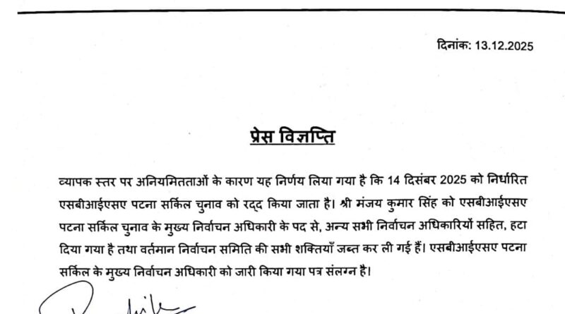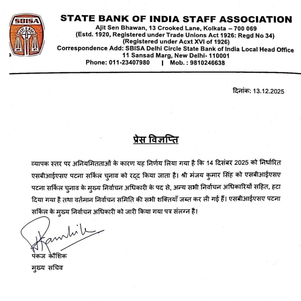 SBISA पटना सर्किल की चुनाव प्रक्रिया तत्काल प्रभाव से रद्द