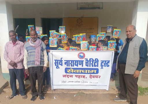 देवघर: आज दिनांक 23.12.25 को सुर्यनारायण चैरिटी ट्रस्ट, सेवाधाम, नन्दन पहाड़ की ओर से उत्क्रमित प्राथमिक विद्यालय, अपर सिंधवा मे शिक्षा पर आधारित कार्यक्रम के तहत करीब 50 से 60 छात्र-छात्राओं के बीच कॉपी एवं कलम का वितरण किया गया। इस अवसर पर विद्यालय के अध्यापक दिलीप कुमार पंडित उपस्थित थे। कार्यक्रम के समापन सभी बच्चों को प्रोत्साहन स्वरूप टॉफी भी ट्रस्ट की ओर से दिया गया।