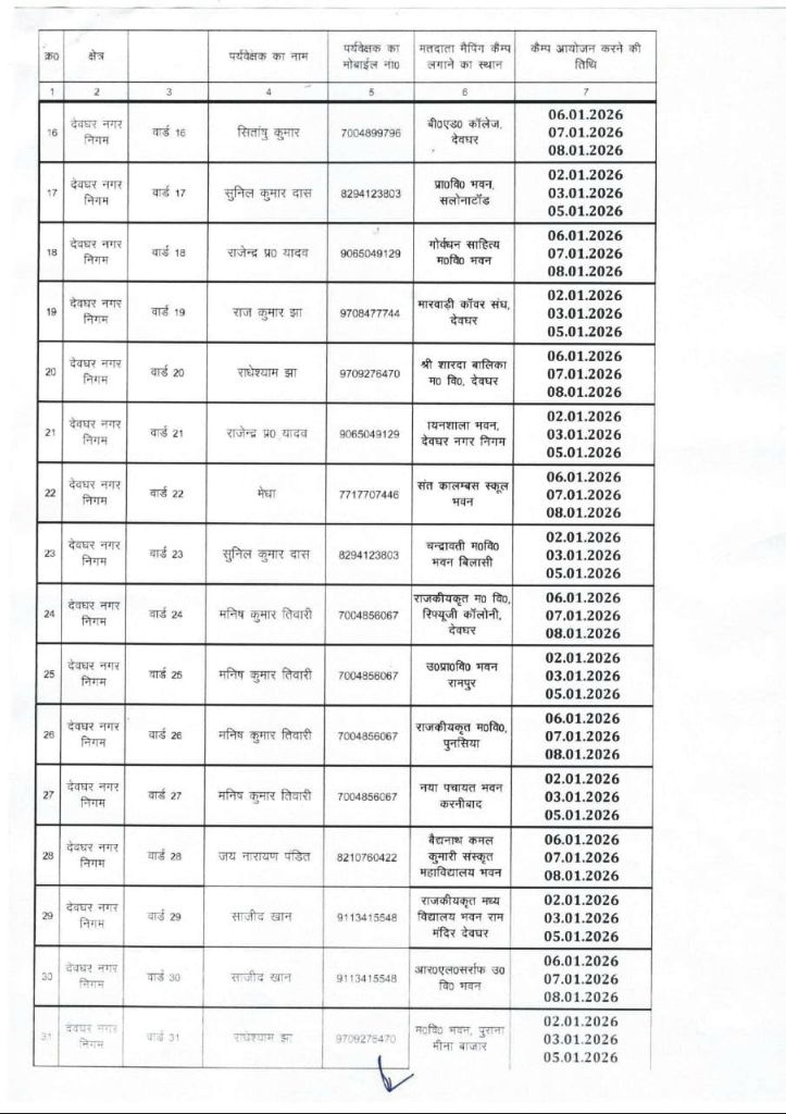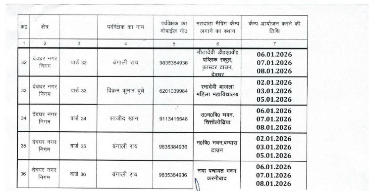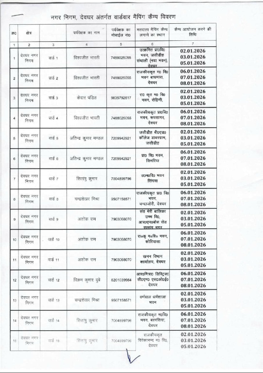 देवघर (शहर परिक्रमा) SIR के लिए विशेष कैंप का आयोजन, अपने वार्ड की तिथि यहाँ देखें 31/12/2025 शहर परिक्रमा देवघर: अनुमंडल पदाधिकारी रवि कुमार द्वारा जानकारी दी गई है कि एसआईआर 2025 के तहत नगर निगम क्षेत्र के सभी 36 वार्ड के मतदाता सूची के आधार पर मैपिंग का कार्य हेतु विशेष कैम्प का आयोजन किया जाना है, जो निम्नलिखित है:-