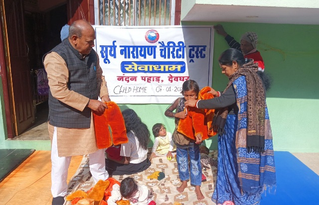 देवघर: इस समय कड़ाके की ठंड (शीतलहर) को देखते हुए सुर्य नारायण चैरिटी ट्रस्ट, सेवाधाम, नन्दन पहाड़, देवघर की ओर से नन्दन पहाड़ देवघर स्थित स्पेशलाइज्ड एडोपरसन एजेन्सी (ईरा) में पल रहे अनाथ 10 (दस) बच्चों को गर्म कपड़ा का वितरण किया गया।