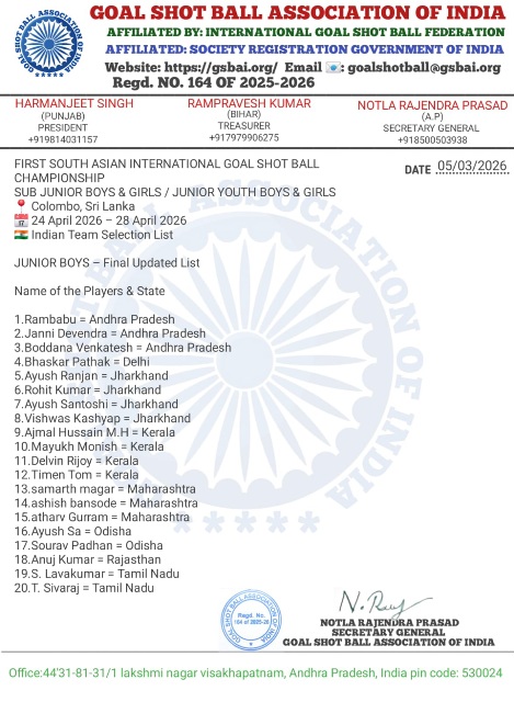 यह चयन ‘फर्स्ट साउथ एशियन इंटरनेशनल गोल शॉट बॉल चैंपियनशिप’ के लिए किया गया है, जो 24 अप्रैल 2026 से 28 अप्रैल 2026 तक श्रीलंका की राजधानी कोलंबो में आयोजित होगी। इस प्रतियोगिता में दक्षिण एशिया के कई देशों के खिलाड़ी हिस्सा लेंगे, जहां भारतीय टीम भी अपनी प्रतिभा का प्रदर्शन करेगी।