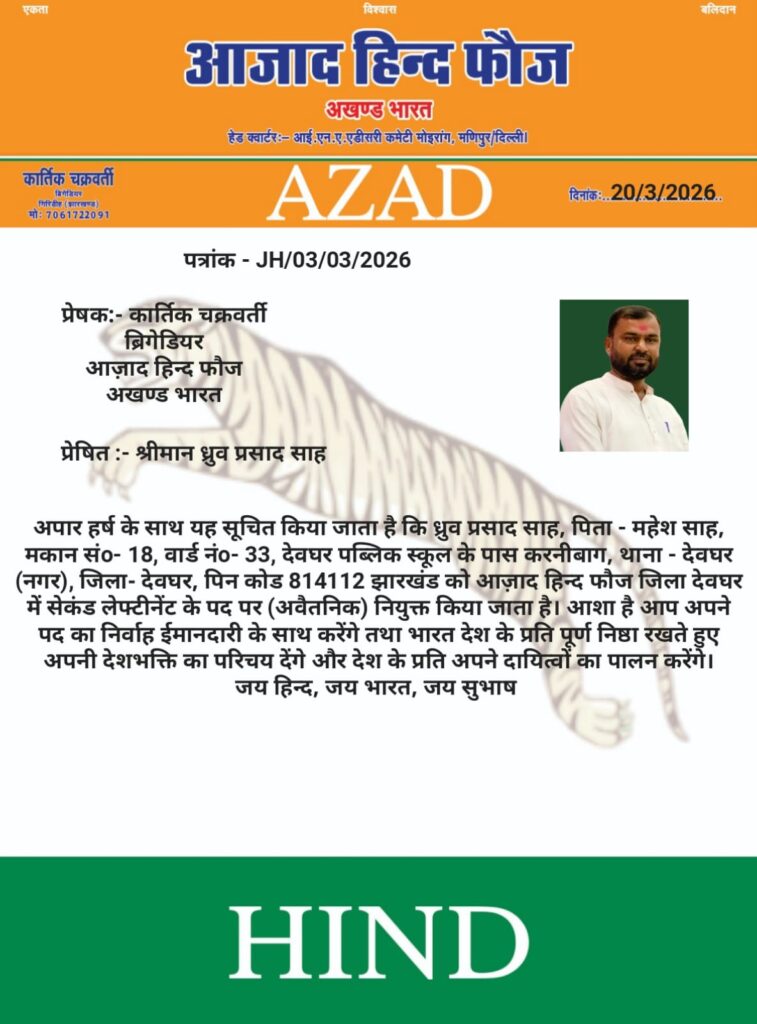 देवघर: आजाद हिंद फौज, अखंड भारत के नाम से जारी एक पत्र के अनुसार देवघर निवासी ध्रुव प्रसाद साह को संगठन में सेकेंड लेफ्टिनेंट (अवैतनिक) पद पर नियुक्त किया गया है।
